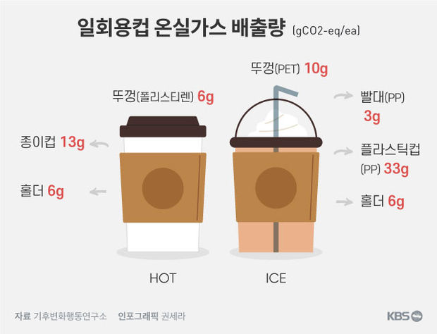 ‘커피 공화국’이라고 해도 틀린 말이 아닐 정도로 커피를 많이 마시는 한국인이 소비하는 커피용 1회용 컵을 그대로 쓰레기 처리할 경우, 일회용 컵을 처리하는 과정에서 발생하는 온실 가스는 25g-52g에 달한다.