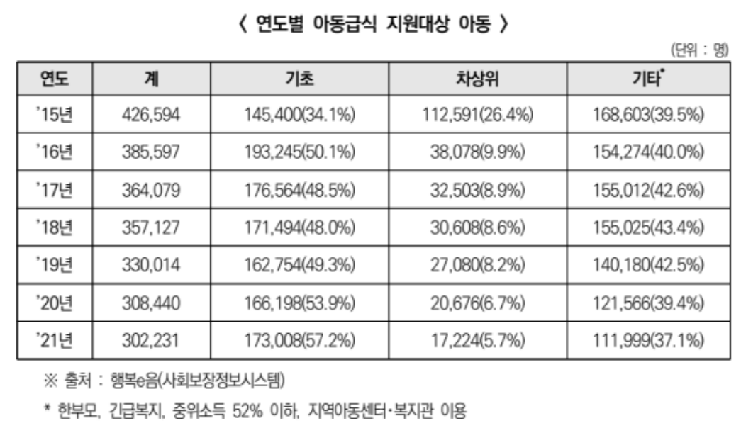 한국도 한 끼 급식비 (7,000원)을 지원 받는 ‘식사를 거를 우려가 있는 어린이’는 총 302,231명에 달한다.