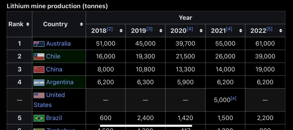 *2020년 기준, 리튬 주요 생산국 순위. 호주가 1위, 미국과 칠레, 아르헨티나가 그 뒤를 잇는다. 남미의 칠레, 아르헨티나, 볼리비아를 ‘리튬 트라이앵글’이라고 부른다. 세계 전체 리튬 매장량의 54%가 매장되어 있다. (Source: Wikipedia 번역 및 요약-운영자)