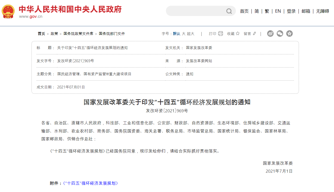 - 国家发展改革委, 国家发展改革委关于印发“十四五”循环经济发展规划的通知, 发改环资〔2021〕969号, 2021年7月1日
