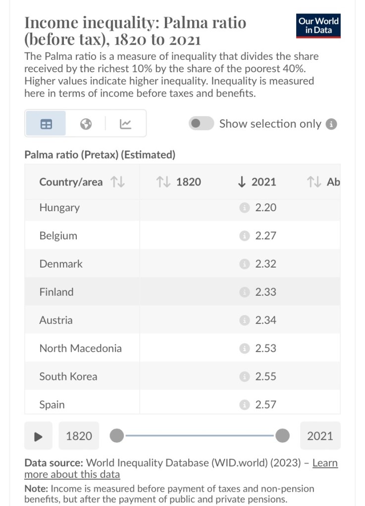 2021년 기준으로 스칸디나비아 국가(아이슬란드, 스웨덴, 노르웨이, 네덜란드 등)들의 팔마 비율은 약 1이다. 상위 10%와 하위 40%가 점유하는 총소득이 거의 같다는 뜻이다.