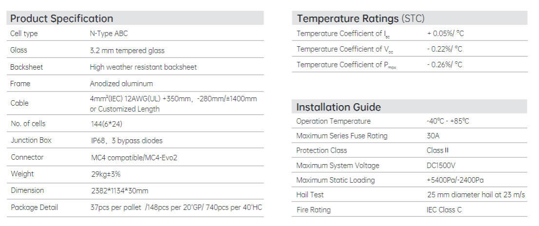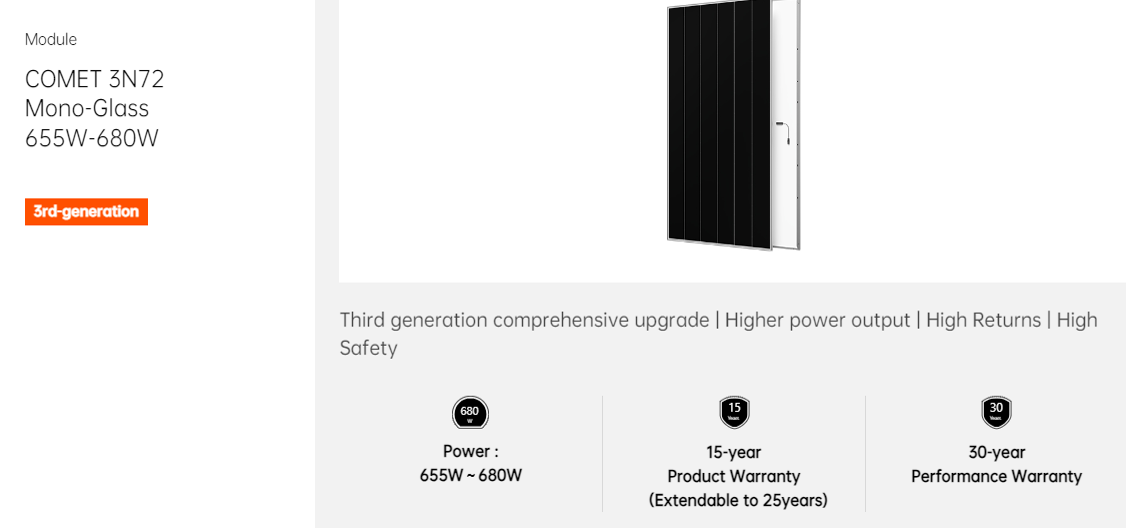 ‘N-시리즈’의 주력 제품인 이 혁신적인 태양광 패널은 시간당 650와트의 전력을 공급할 수 있다. N형 광전지는 햇빛을 전기로 전환하는 비율이 25.2%에 달해 오늘날 시장에서 가장 높은 효율의 전지이다. .