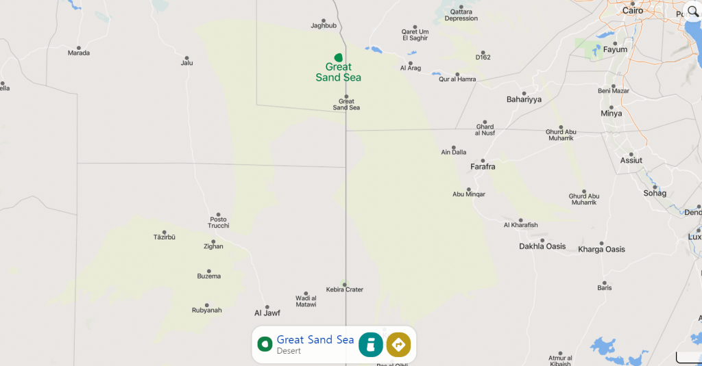 이집트의 서쪽과 리비아 동쪽 국경을 사이에 두고 면적 72,000 제곱 킬로미터에 달하는 사막 지대인 Great Sand Sea가 있다. 서울특별시 전체 면적이 약 605 제곱 킬로미터이니 서울시의 100배가 훨씬 넘는 광활한 지역이다.