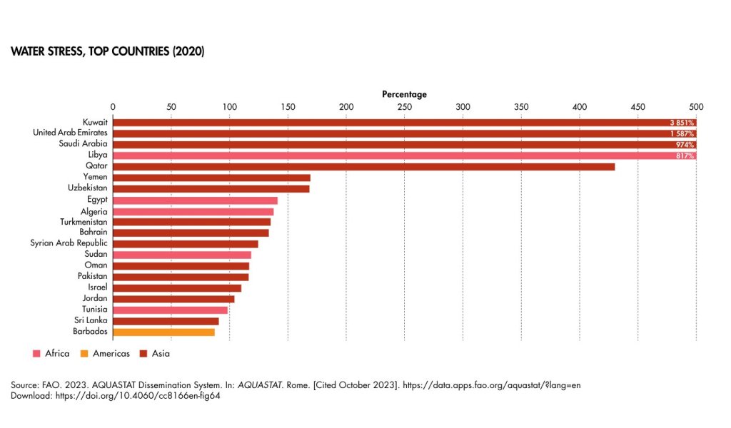 중동 국가들(쿠웨이트, 아랍 에미레이트, 사우디 아라비아, 리비야, 이집트 등)은 물 부족 국가 상위를 차지하고 있다. Most water stressed countries in the world in 2020 (Source: Wikipedia)