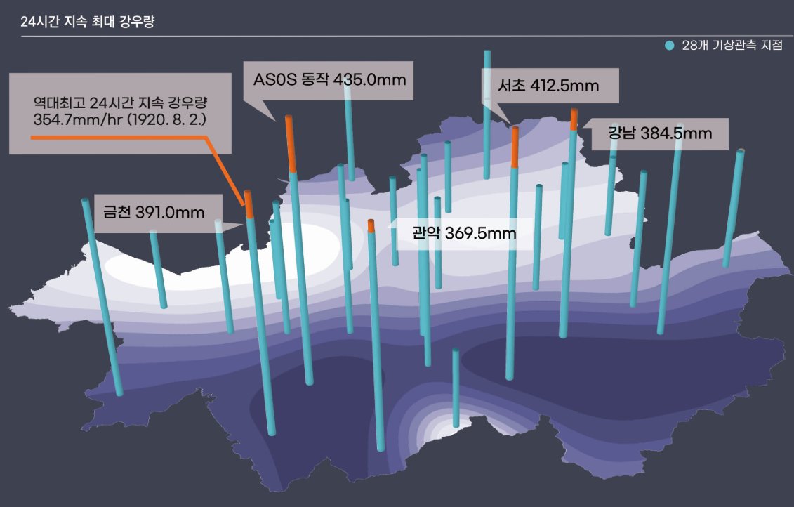 지난 2022년 8월, 이틀 동안 서울, 경기도 주요 지역에 1시간 최대 강우량 141mm, 24시간(1일) 지속 강우량 435 mm를 기록하여 기상 관측 역사상 200년 만에 한도 초과를 기록했습니다.
