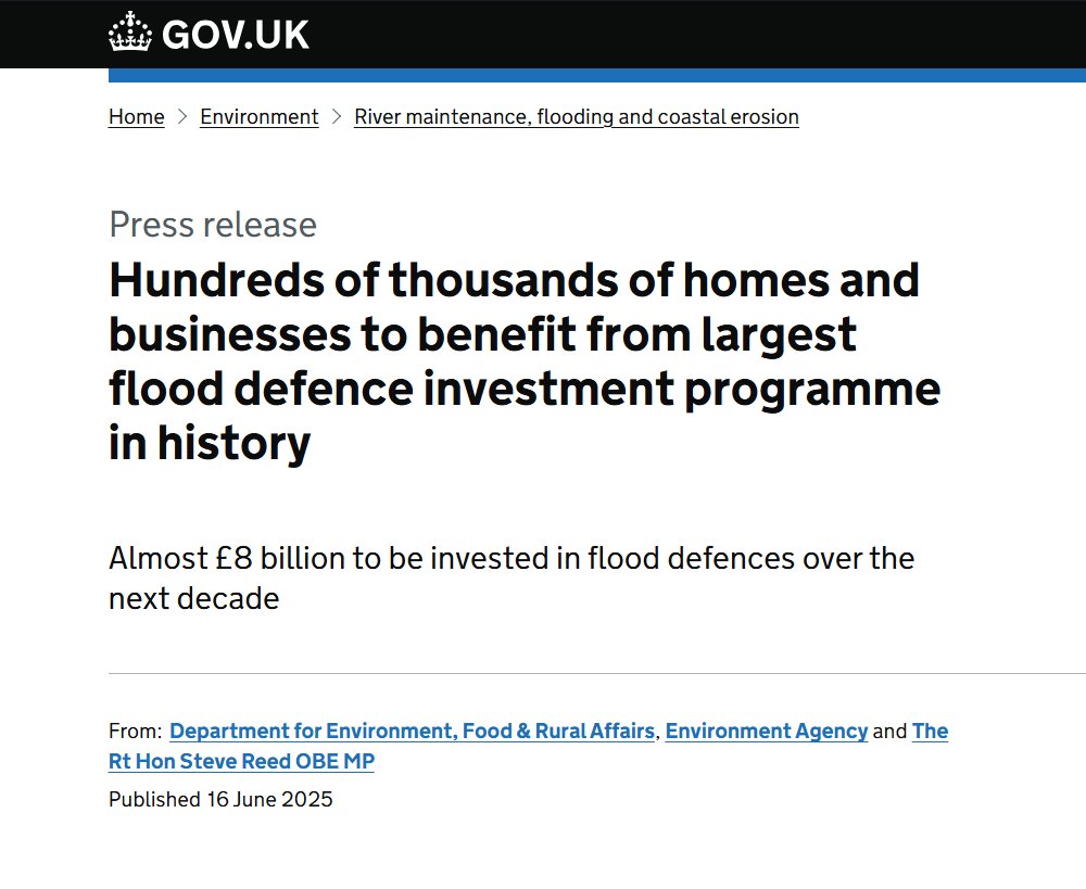 - Department for Environment, Food & Rural Affairs, Environment Agency and The Rt Hon Steve Reed OBE MP(UK), “Hundreds of thousands of homes and businesses to benefit from largest flood defence investment programme in history”, GOV.UK, 16 June 2025 (https://www.gov.uk/government/news/hundreds-of-thousands-of-homes-and-businesses-to-benefit-from-largest-flood-defence-investment-programme-in-history)