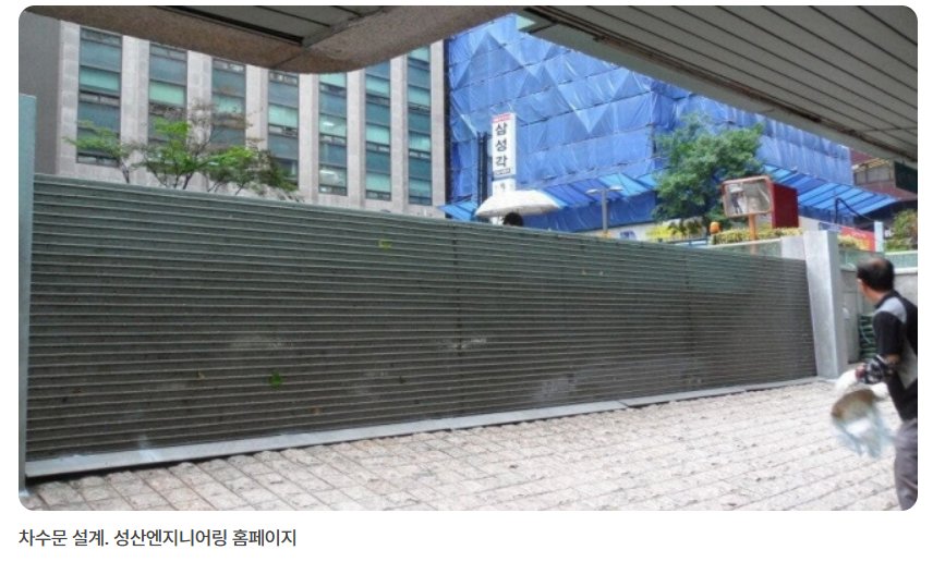 한국에서도 방수벽을 설치하여 홍수 피해로부터 건물을 보호한 성공적인 사례가 있습니다. 지난 2022년 8월, 서울 강남 지역에 대형 홍수 사태가 났을 때에 피해를 입지 않은 유일한 건물이 서초구에 위치한 ‘청남빌딩’ 입니다.