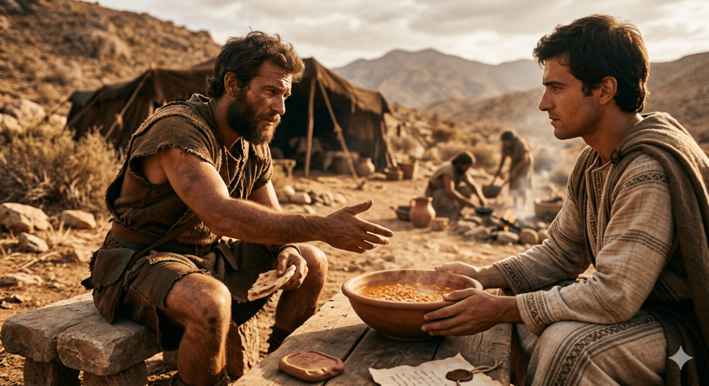 심하게 허기가졌던 에사우는 ‘배고파 죽게 생겼는데, 장자의 권리 따위가 뭐 그리 대수인가?’ 라고 말하며, 자신의 위치에 대한 의미도 모른 채, 기껏 배고픔을 달래고자 빵과 렌틸 죽 한그릇과 ‘맏아들 권리’를 맞바꾸어 동생에게 팔아버린 후, 그 음식을 먹고 마시고 밖으로 나갑니다.